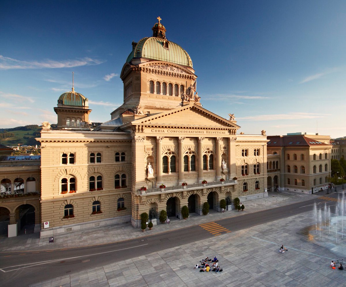 Web oficial]: La imponente sede de la Asamblea Federal se alza sobre una elevación del terreno frente al Aare. Aunque su cara norte mira hacia la Bundesplatz, la vista más atractiva se consigue desde el sur, desde Monbijoubrücke, un puente sobre el Aare. La Bundeshaus (edificio del Parlamento) fue diseñado W. H. Auer en un llamativo estilo neorrenacentista y se finalizó en 1902. En el centro del edificio se encuentra un espacioso salón abovedado, decorado con cuadros que ilustran acontecimientos importantes de la historia suiza. La bóveda luce paneles de vidrio emplomado con los emblemas de las regiones y cantones y vidrieras con alegorías de la justicia, la educación, las obras públicas y la defensa. El salón de asambleas está adornado con pinturas que representan a los delegados de los cantones de Uri, Schwyz y Unterwalden jurando su pacto de alianza en la pradera de Rütli en 1291. La Bundeshaus está flanqueada por otros dos edificios gubernamentales: el que se halla al este fue diseñado por Auer y construido en 1892, y el del oeste fue obra de F. Studer y se levantó en 1857.